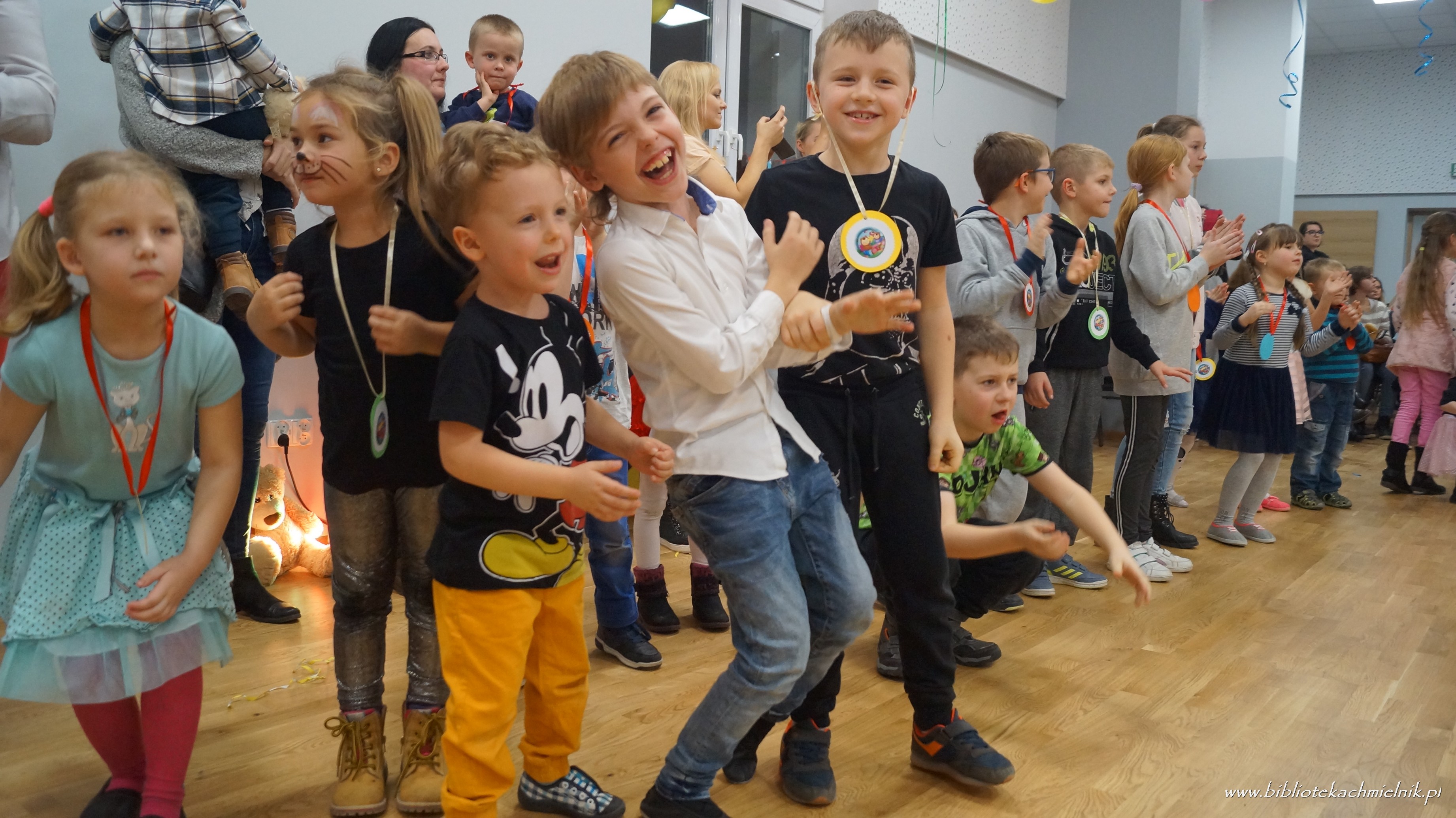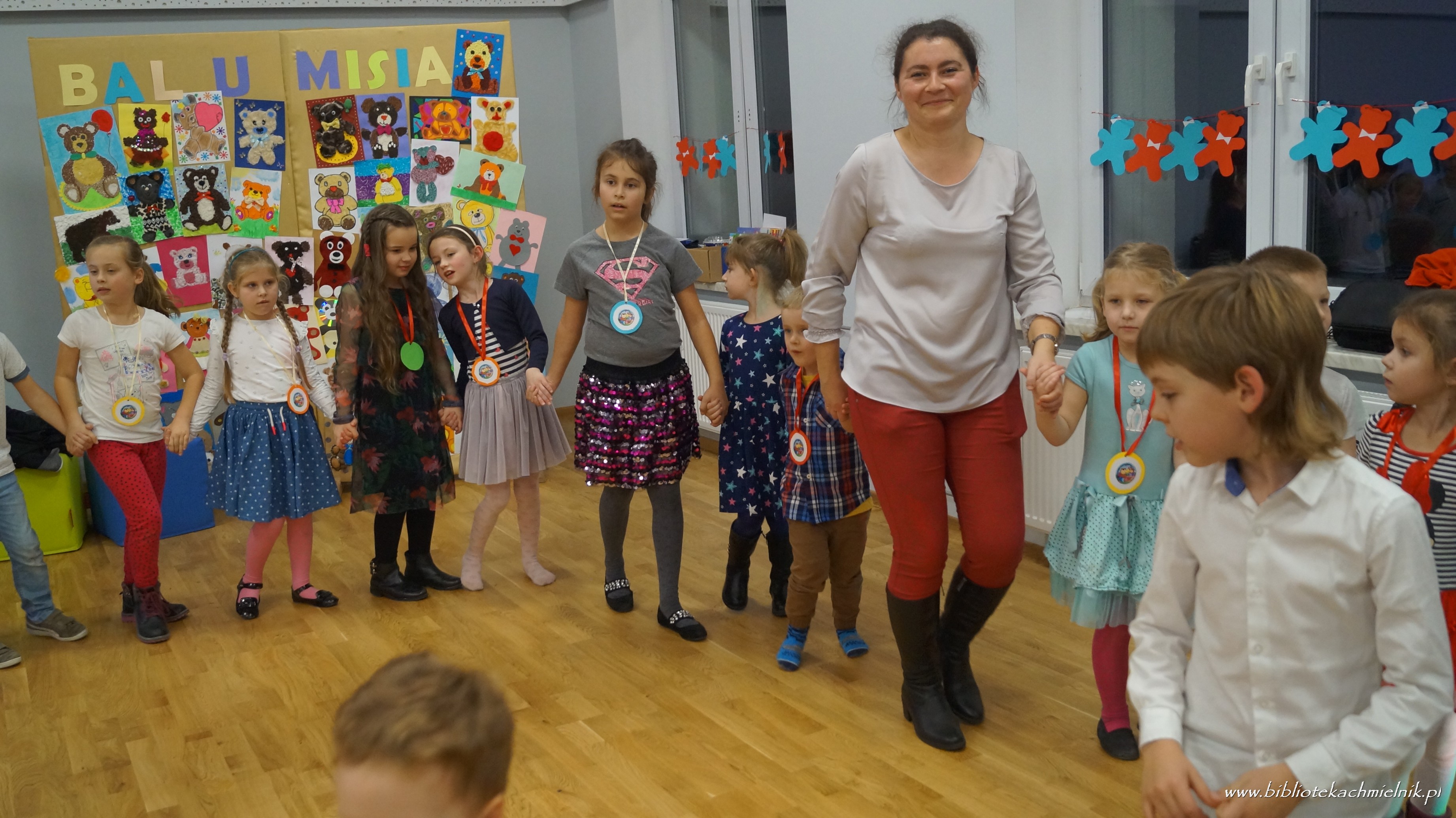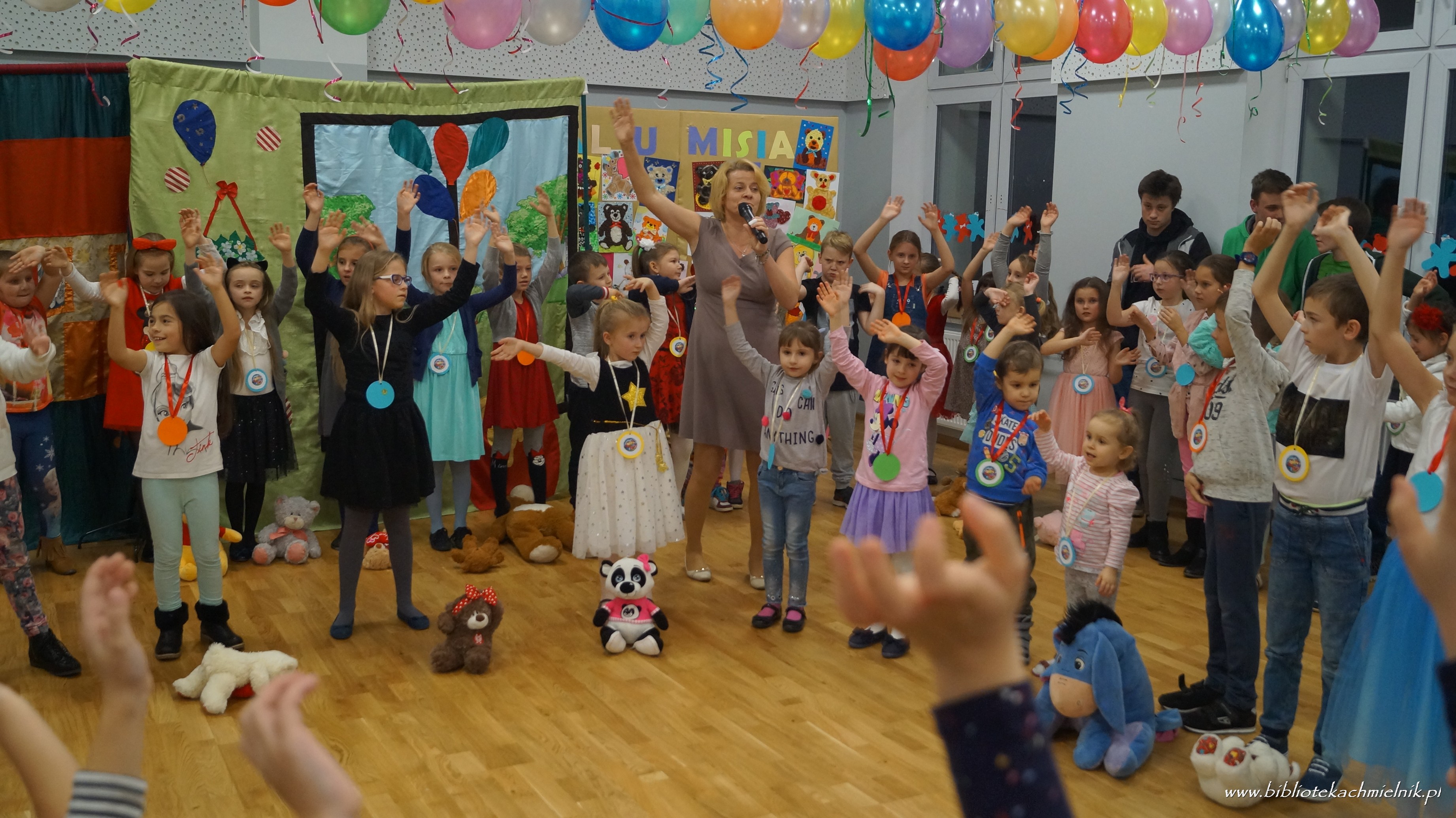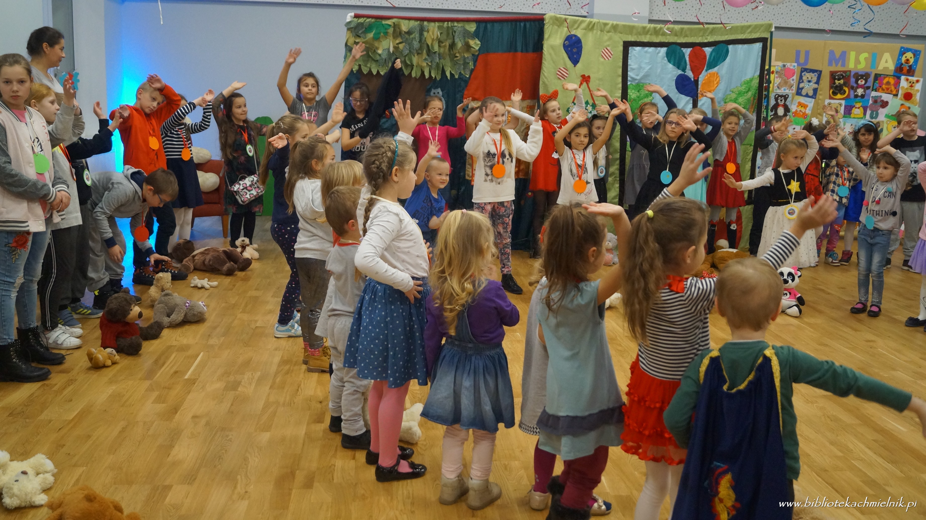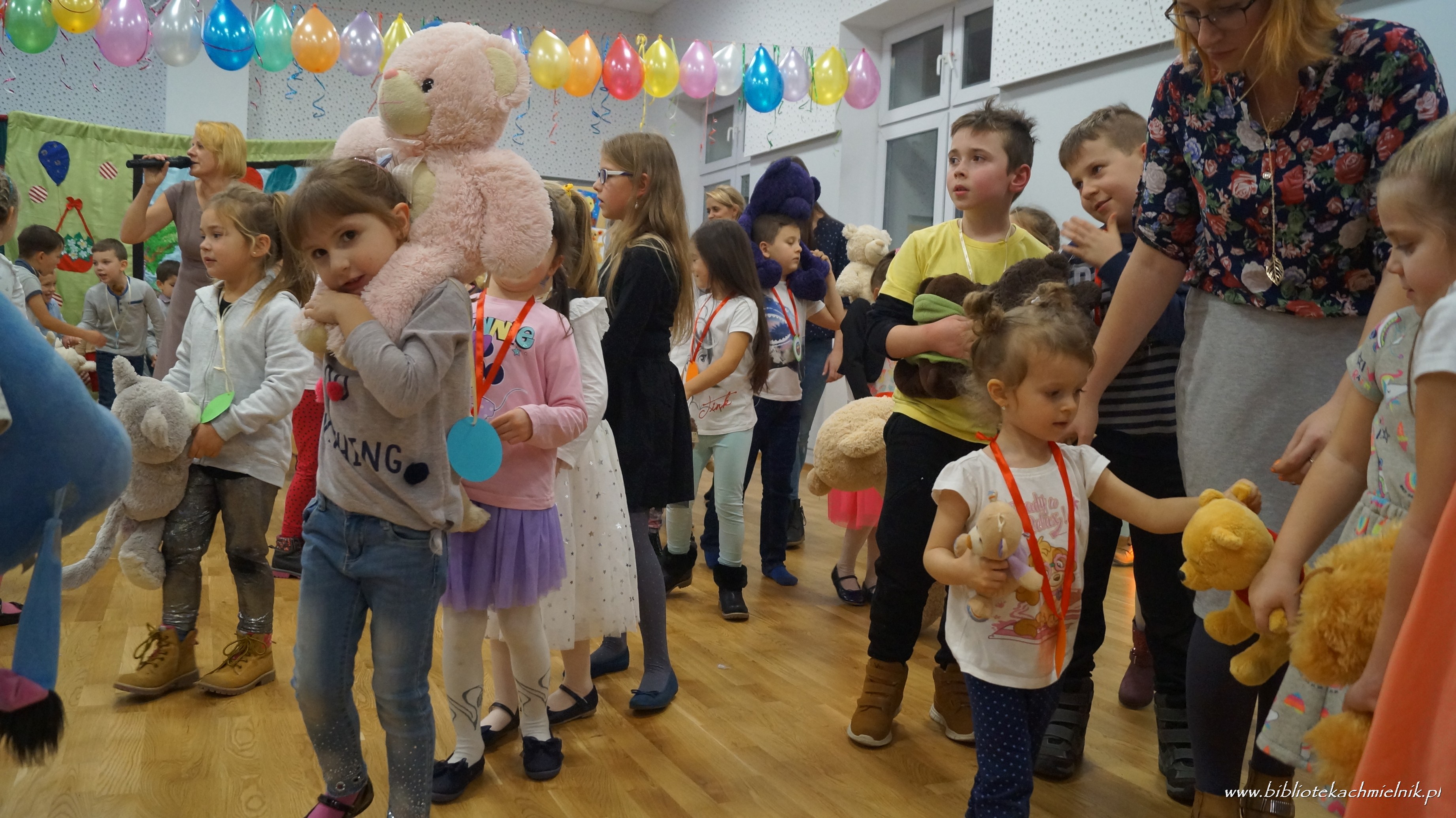 Miś, najukochańsza zabawka dzieci jest z nami już 116 lat. Jej posiadanie jest niezwykle ważne dla rozwoju emocjonalnego, dlatego Maluchy są często zasypywane różnymi maskotkami, ale tylko jedna z nich w efekcie staje się tą najważniejszą. Dzieci w ten sposób zyskują poczucie bezpieczeństwa i w tym małym pluszowym misiu mają wiernego przyjaciela, powiernika, towarzysza dziecięcych zabaw, przytulankę. Misie są zabierane na spacery, na obiadek, do lekarza i do łóżeczka. Czasami to miś pierwszy dowiaduje się o wszystkim co dla dziecka ważne, a nawet ociera łzy. O tym jak bardzo dzieci lubią misie świadczyła frekwencja na "Balu u Misia", który został w tym roku zorganizowany w Chmielniku przez bibliotekarki-animatorki. Misiowe urodziny świętowało z nami 164 dzieci, ale tę liczbę trzeba podwoić, bo każde dziecko przyniosło ze sobą ukochanego misia. Wstępem do zabawy było przedstawienie teatralne "Bajowe przygody mojego misia" w wykonaniu grupy Edu-Artis. Na widowni zasiedli mali widzowie i ich pluszowi przyjaciele. Po zakończonym spektaklu każdy miał ochotę na wspólne zdjęcie z misiem-aktorem. Nie wszystkim się to udało, ale wszyscy mogli być na jednej grupowej fotografii. Po takim wstępie dzieci były gotowe na prawdziwy, taneczny bal. Tańcom i radości nie było końca, czasami trudno było dotrzymać kroku najlepszym balowym tancerzom, ale bardzo liczna grupa świetnie bawiła się na parkiecie uczestnicząc w zabawach animacyjnych, konkursach i tanecznej integracji. W przerwie między jednym, a drugim maratonem tanecznym, odbyło się bardzo wyczekiwane przez dzieci wręczenie nagród w konkursie plastycznym. Konkurs na "Portret Misia" zgromadził 174 prace, wykonane z dużą pomysłowości i różnymi technikami. Komisja konkursowa miała bardzo trudne zadanie i ostatecznie wybrała 60 laureatów. Nagrody książkowe trafiły do 46 uczestników konkursu, natomiast zestawy upominkowe do 14. Na "Balu u Misia" nie mogło zabraknąć "małego co nieco" i oczywiście miodku, misiowego przysmaku, który tym razem był dodatkiem do herbaty. Dodatkową atrakcją dla dzieci było malowanie buziek, w które przez cały czas trwania zabawy tanecznej zaangażowani byli członkowie nieformalnej grupy Strefa Kultury Młodzieżowej. Młodzi tancerze i ich misie zmęczeni, ale radośni odtańczyli ostatni taniec i razem ze swoimi pluszowymi przyjaciółmi wrócili do domów. Kolejne urodziny misia już za rok, ale może to nie będą jedyne taneczne harce jakie mamy w zanadrzu dla najmłodszych. Bądźcie czujni!