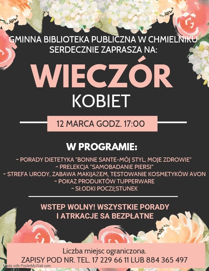 Dzień Kobiet można świętować na różne sposoby. Panie z Gminy Chmielnik zapraszamy na Wieczór Kobiet w dniu 12 marca na godz. 17:00. W programie m. in.: porady dotyczące zdrowej diety, Strefa zdrowia kobiety (instruktaż samobadania piersi), strefa urody (zabawy makijażem, testowanie kosmetyków), pokaz produktów tupperware, słodki poczęstunek. Zainteresowane Panie prosimy o kontakt pod numerami telefonów: 17 2296 611 i 884 365 497, ponieważ mamy ograniczoną liczbę miejsc.