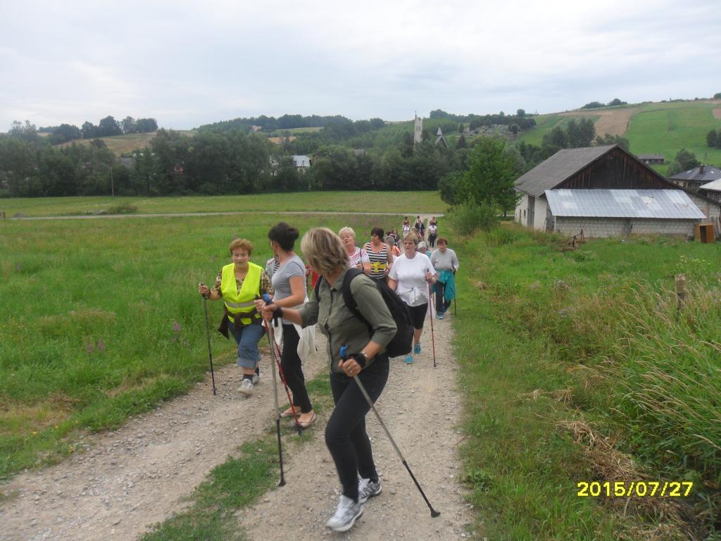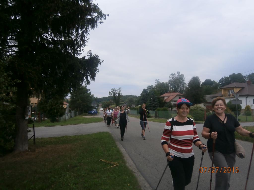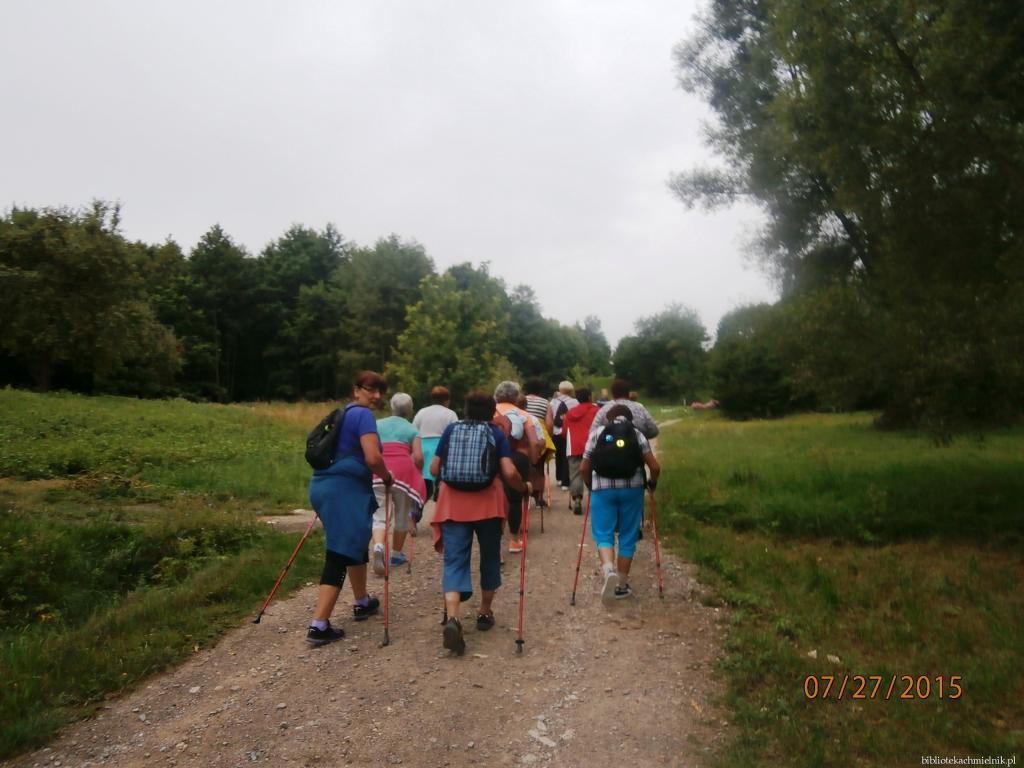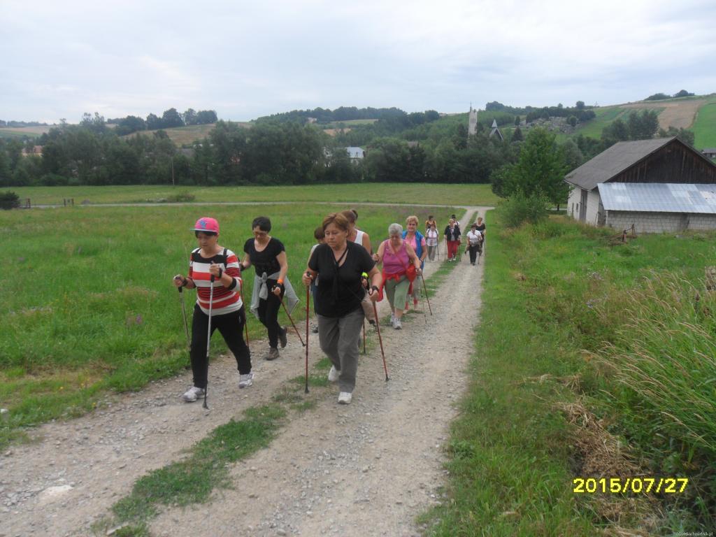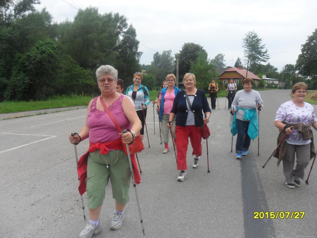 Po chmielnickich pagórkach przyszedł czas w projekcie z wykorzystaniem Nordic Walkig na odkrywanie uroków innych zakątków naszej gminy. Wybór padł na trasę, która wiodła z parkingu przy kościele parafialnym w Błędowej Tyczyńskiej do domu ludowego w Borówkach. Grupa projektowa stopniowo podnosi poprzeczkę dlatego i trasa była dłuższa i osób było więcej niż za pierwszym razem. Zachęcone przykładem i możliwością marszu w dużej grupie dołączyły do nas osoby bezpośrednio nie związane z projektem. Nie była to łatwa droga, bo pięła się coraz wyżej w górę, dodatkowym utrudnieniem był drobny letni deszczyk. Jednak w tak licznej gromadzie trudności nie są straszne. U mety czekały na uczestników panie, które ze względów zdrowotnych nie brały udziału w tym wymagającym kondycji marszu i przygotowały poczęstunek dla zdrożonych piechurów. Ale to nie wszystkie atrakcje z tego dnia. Zgodnie z założeniem projektu "Niewiele nam do zdrowia potrzeba trochę ruchu na świeżym powietrzu, poezji i chleba" był czas dla ucztę dla ducha, którą przygotowała pani Halina Borowska. Od lekkiej poezji, która sama tworzy poprzez żartobliwe strofy i utwory zebrane od mieszkańców gminy, doszła do wierszy polskich noblistów: Wisławy Szymborskiej i Czesława Miłosza angażując w odkrywanie piękna zawartego w poezji również inne uczestniczki projektu. Została w zmaganiach konkursowych sprawdzona wiedza uczestników dotycząca polskiej poezji. W nagrodę można było otrzymać tak bardzo niezbędną podczas uprawiania Nodic Walking kamizelkę odblaskową. Jak nakazuje tradycja spotkań w Kołach Gospodyń Wiejskich były również wspólne śpiewy i przypominanie starodawnych przyśpiewek młodszym osobom, które dołączyły do tegoż projektu w tym dniu. Dopełnieniem tej relacji są zamieszczone poniżej zdjęcia. Mamy nadzieję, że to zachęci do aktywności osoby wciąż wahające się czy marsz z kijkami to jest sport dla nich.