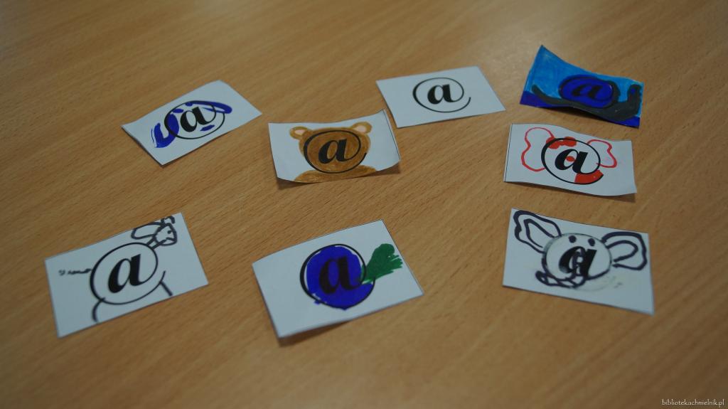 Rozpoczęliśmy od zajęć ruchowych w takt muzyki aby z energią przystąpić do rozwiązywania internetowych zagadek. Następnie dzieci odszukały elementy układanki, która odsłoniła przed nimi temat zajęć. Kolejnym punktem było podzielenie się na grupy, w tym przypadku na grupę: dziewcząt i chłopców, i graficzne przedstawienie skojarzeń jakie dzieci mają z Internetem. Dziewczęce skojarzenia były bardziej uporządkowane, chłopięce oddały istotę Internetu, w którym oprócz wielu wartościowym informacji i materiałów możemy znaleźć to co |"zaśmieca" sieć, a czasem bywa niebezpieczne. Kolejno obejrzeliśmy jak zbudowany jest router, jak połączone są komputery w sieć biblioteczną i próbowaliśmy zbudować sieć z uczestników zajęć. Po zadaniach ruchowych przyszedł czas na myślenie i wskazanie różnic między adresem, pod który możemy udać się fizycznie i adresem internetowym. Rozmawialiśmy o tym czego możemy dowiedzieć się z domen internetowych: edu., mil., org. i rozszerzeń dla poszczególnych krajów, regionów czy miast jakie zawierają często adresy internetowe. Wykorzystując tablety uczestnicy wyszukiwali podane przez prowadzącą strony w Internecie, porównując ich adresy internetowe i treści jakie przekazują. Rozmawialiśmy także na temat przesyłania e-maili, znaczenia znaku "@" w adresie mailowym, ale też tego jak jest tłumaczony w innych językach. I to co u nas jest @małpą, w Niemczech jest małpim ogonem, w Rosji psem, we Włoszech ślimakiem. A sam znak jest dużo starszy niż Internet i wykorzystywany był w handlu. Tym sposobem odpowiedzieliśmy sobie na postawione przez autora książki pytanie: skąd się wzięły małpy w Internecie. Finałowym punktem zajęć było praktyczne zastosowanie kodu ASCII. Jest to rodzaj szyfru, który każdą literę, cyfrę bądź inny znak zamienia na zera i jedynki aby mogła być przesłana przez Internet. Uczestnicy za pomocą tego kodu zaszyfrowali swoje imiona, a następnie wspólnie sprawdzili, czy nie doszło do pomyłek i czy Oliwia na pewno jest Oliwią, a Michał Michałem.