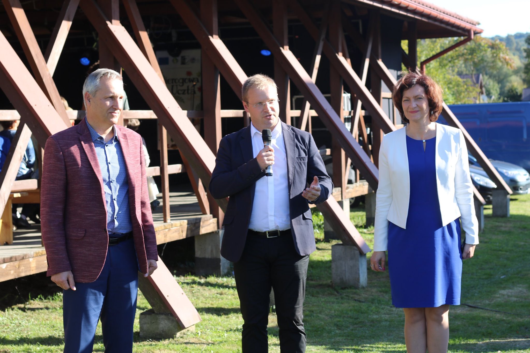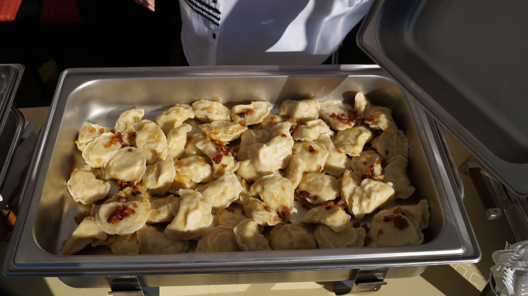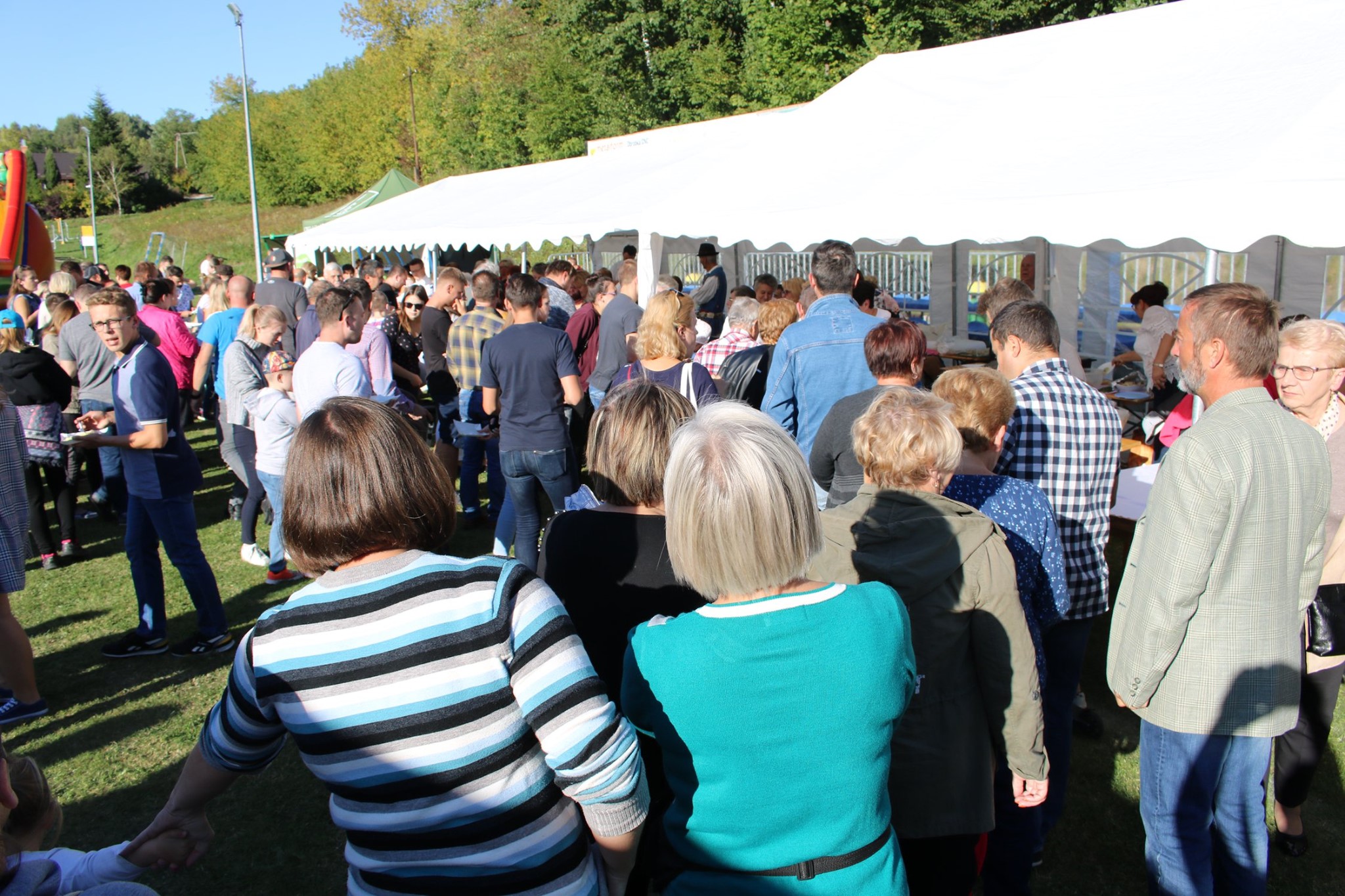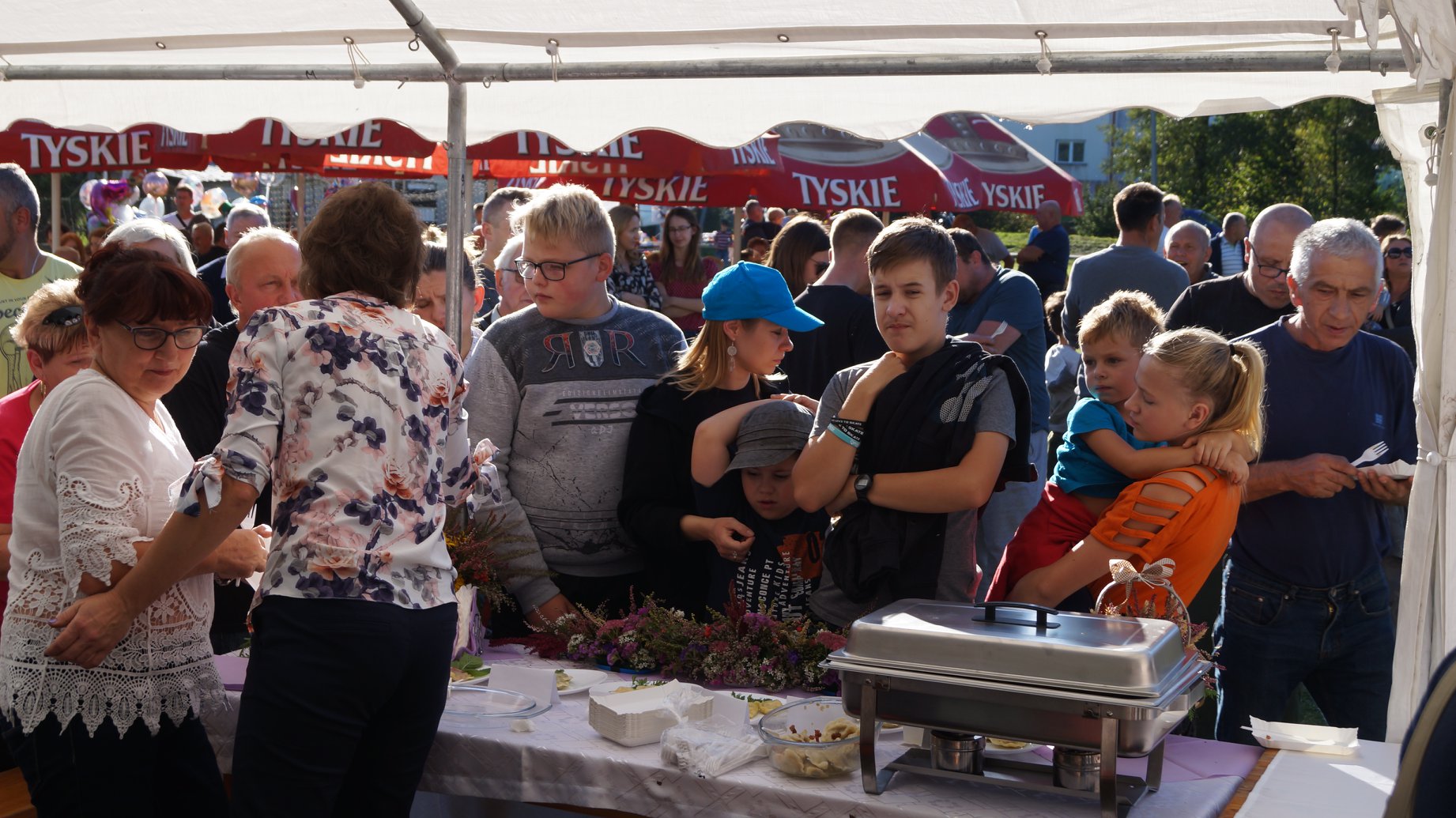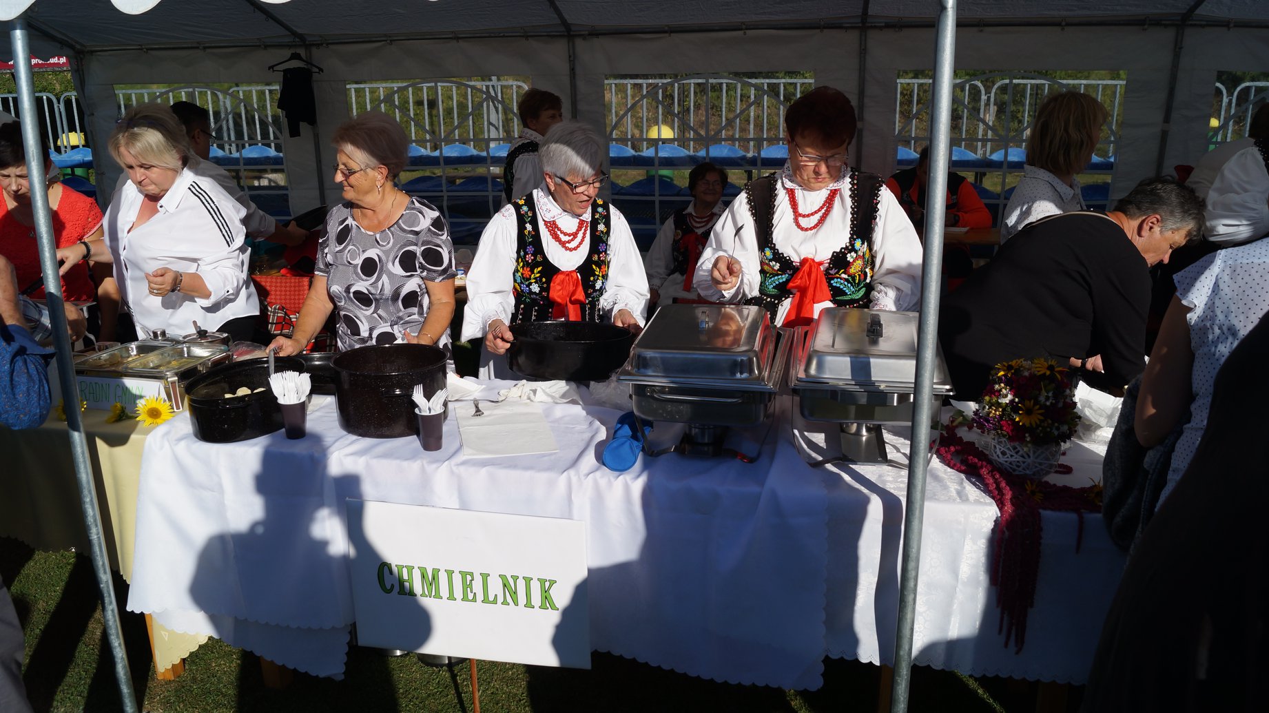 Tak pomyślany stół pojawił się w na stadionie Galicja w Chmielniku 14 września w niedzielę. Jesienne słońce sprzyjało temu międzypokoleniowemu, integracyjnemu spotkaniu mieszkańców gminy. Ale nie tylko mieszkańcy byli gośćmi tego wydarzenia, bo wieść o tym że odbędzie się Pierogowa Uczta zatoczyła szerszy krąg i zwabiła do Chmielnika smakoszy pierogów z innych miejscowości. Jak sam tytuł imprezy wskazuje na stole królowały pierogi. Każdy mógł znaleźć te przez siebie ulubione lub spróbować całkiem nowego smaku, bo Ci którzy przygotowywali pierogowe menu prześcigiwali się w pomysłach aby ich pierogi były najbardziej zaskakujące. Największym powodzeniem cieszyły się pierogi ruskie czyli z ziemniakami i serem, ale można było także skosztować pierogów z kapustą i serem, z serem i pokrzywą, z kapustą i grzybami, z ziemniakami i miętą, z kaszą gryczaną i serem, z mięsem i cieciorką, z kaszą gryczaną pieczarkami i boczkiem, przednówkowe z ziemniakami oraz na słodko ze śliwkami. Dominowały pierogi gotowane, ale do degustacji w ofercie były także pieczone. Pierogowe menu wzbogacał żurek, chleb ze smalcem i kiszonymi ogórkami, ciasto z dyni, domowe konfitury, ciasta w różnych konfiguracjach oraz ciasteczka. Nad przygotowaniem tych smakołyków pracowały wytrwale panie z Kół Gospodyń Wiejskich z Błędowej Tyczyńskiej, Borówek, Chmielnika, Zabratówki, członkowie rady sołeckiej z Woli Rafałowskiej i radni Gminy Chmielnik. To ich ręce ulepiły ponad 4000 pierogów, które zniknęły ze stołu w ekspresowym tempie, co pokazuje jakim popytem się cieszą.