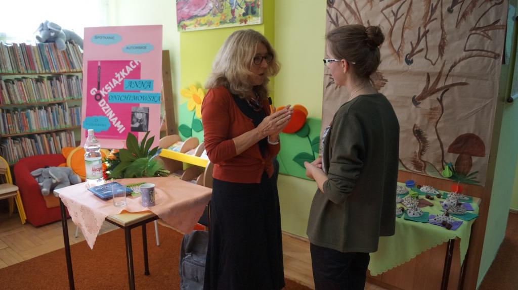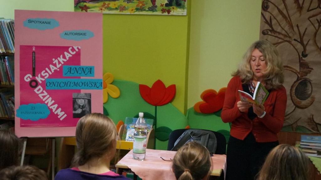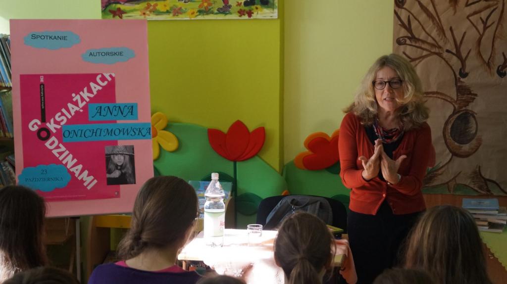 Anna Onichimowska, bo to o niej mowa, autorka książek dla dzieci i młodzieży, a ostatnio również dla dorosłych, opowiadała młodzieży o swoim życiu, doświadczeniach, licznych podróżach, a przede wszystkim o książkach. Autorka ma mieszkanie w Warszawie, blisko lasu, bo pisząc lubi rozmyślać w otoczeniu przyrody, ale jak sama mówi rzadko w nim bywa, ponieważ jej drugim domem od jakiegoś czasu jest Finlandia. Gdy zaczynała swoją przygodę z pisarstwem była przeświadczona, że może pisać tylko dla dzieci, bo to ich świat był dla niej magiczny. Z dzieciństwa wyniosła fascynację dla książki "Muminki", potem zaczęła tworzyć własne historie. I tak powstała cała seria książek dla dzieci, które miały formę krótkich opowieści, bo autorka jest fanką opowiadań, jako pisarz, ale jako czytelnik również. Potrzeba chwili i propozycja wydawcy zbliżyła ją do problemów jakie dotykają młodzież, później zyskała miano specjalistki od trudnych tematów. W swoich książkach porusza problemy narkomanii, przynależności do sekt, wykluczenia społecznego, izolacji, uzależnienia od Internetu. Tematy niesie samo życie i baczna obserwacja. Często są to przypadkowe rozmowy, podczas których rodzi się pomysł: ??historie są od lat te same, inny jest tylko sposób ich opisywania?. Jej zdaniem każdy ma odrębny styl w jakim pisze, a więc pisanie to bardzo osobista rzecz. Praca nad książkami dla młodzieży dała jej okazję do spotkań z młodymi ludźmi, którzy borykają się z różnego rodzaju problemami i pozwoliła na głębsze poznanie ich świata, potrzeb, oczekiwań. To od nich samych dowiedziała się, że na tym najtrudniejszym etapie wchodzenia w dorosłość potrzebują miłości, zrozumienia i czasu jaki może ofiarować im rodzina. Gdy tego zabraknie pojawiają się problemy i poszukiwanie czegoś co będzie namiastką. Tutaj nie ma znaczenia położenie geograficzne, czy kolor skóry, potrzeba miłości i akceptacji jest taka sama na całym świecie. Pisarka lubi gdy główni bohaterowie jej książek to mężczyźni, ponieważ męski punkt widzenia nie rodzi bezpośrednich skojarzeń z nią samą. Pisze tradycyjne, od początku do końca. Pisząc, poznaje swoich bohaterów stopniowo podobnie jak czytelnik, później to oni stają się mądrzejsi od niej samej. Ta niewiedza o nich daje przyjemność pisania w ciekawy sposób, ale też czyni ten świat fikcyjny bardziej realny, prawie równoległy do rzeczywistego.