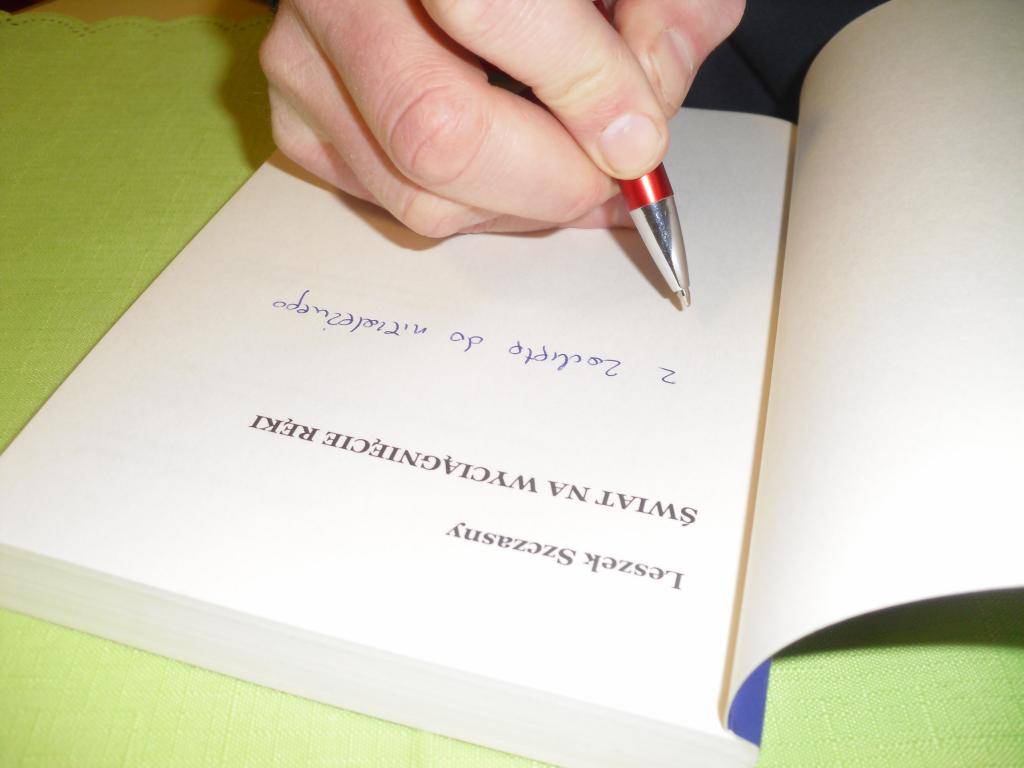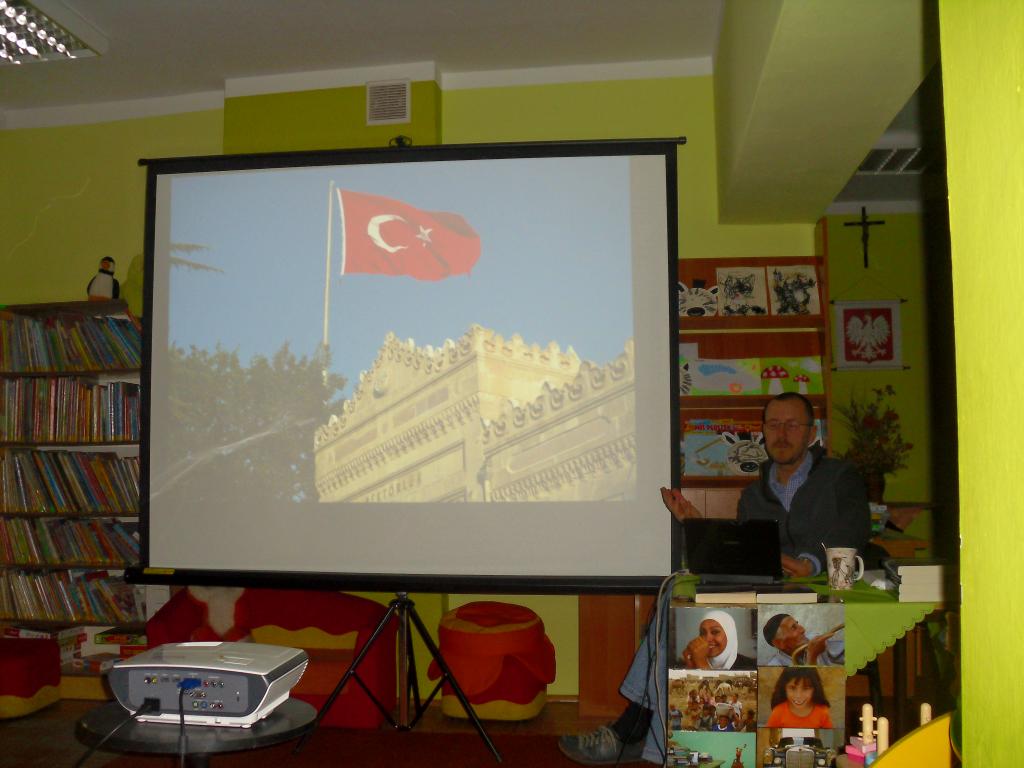 Takimi słowami powtórzonymi za Napoleonem Bonaparte Leszek Szczasny wprowadził nas w klimat spotkania. I nie dostaliśmy figi, która jest niezwykle popularna w Turcji. Ale lekkim krokiem podróżnika przekroczyliśmy bramy miasta, które od zawsze łączyło Zachód ze Wschodem i gdzie przemieszanie się tych dwóch wielkich kultur dało takie zaskakujące efekty. Spotkanie miało charakter slajdowiska, podczas którego każde zdjęcie gościa opatrzone było jego poważnym, bądź też żartobliwym komentarzem. Turcja jego oczyma to kraj ludzi gościnnych, którzy są ufni i nie oceniają przybysza po kolorze skóry czy wyglądzie, nie sprawdzają dokumentów wietrząc podstęp. Oni po prostu cieszą się, że ich ojczyzna jest tak licznie odwiedzana i zawsze śpieszą z pomocą. To tam pokoje dzienne wychodzą na ulicę i każdy może schronić się w cieniu cudzego tarasu i liczyć na świeżo zaparzoną herbatę. Bo Turcja to również kraj herbaty, pochodzącej znad Morza Czarnego, parzonej w samowarze i o innym smaku niż my ją znamy w Polsce. I nieprawdą jest, że kawa po turecku to napój narodowy. Króluje na tureckich stołach właśnie herbata. Ale oprócz tego napoju jest jeszcze wiele charakterystycznych elementów dla Turcji, chociażby przyprawy sprzedawane nie na gramy tylko na kilogramy. Wszędzie kuszą także swoim zapachem, kolorystyką i ilością ułożone w ogromne piramidy owoce. No i co najważniejsze dla krajów Wschodu, na każdym kroku przybysza otaczają kolorowe dywany. Dywan to nie tylko element dekoracyjny w domach. Jest on podstawowym elementem wystroju meczetów. Jak dowiedzieliśmy się od naszego gościa meczet pełni ważną rolę w życiu nie tylko religijnym, ale również społecznym. Oczywiście głównie jest domem modlitwy, ale jest to też miejsce gdzie można medytować, uczyć się, odpocząć, czasem nawet zdrzemnąć. Wtedy dywany bardzo się przydają. Jego dzieciniec jest oazą, w której toczy się życie przez cały dzień, ludzie rozmawiają, chroniąc się przed słońcem, a dzieci grają w piłkę. Nie ważne czy to w mieście czy na wsi, w meczecie bije serce miejscowości. Charakterystycznym elementem tureckiego krajobrazu jest także flaga i nie tylko ze względu na jej intensywny kolor, ale na ilość flag widocznych dosłownie w każdym miejscu. Polacy wieszają flagę tylko w czasie ważnych rocznic czy wydarzeń, Turcy umieją się nią chlubić przez cały rok. Duży wpływ na zbudowanie takiej tożsamości mieszkańców tego muzułmańskiego, ale nie arabskiego kraju miał Atatük, pierwszy prezydent Turcji, którego wizerunek możemy napotkać na każdym banknocie i w eksponowanych miejscach.